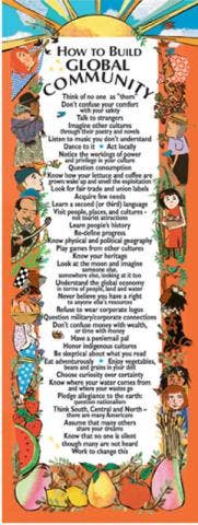 Think of no one as "them" Don't confuse your comfort with your safety Talk to strangers Imagine other cultures through their poetry and novels Listen to music you don't understand*dance to it Act locally Notice the workings of power & privilege in your culture Question consumption Know how your lettuce and coffee are grown: wake up And smell the exploitation Look for fair trade and union labels Help build economies from the bottom up Acquire few needs Learn a second(or third) language Visit people, places, and cultures - not tourist attractions Learn people's history*re-define progress Know physical and political geography Play games from other cultures*watch films with subtitles Know your heritage Honor everyone's holidays Look at the moon and imagine someone else, Somewhere else, looking at it too Read the UNS universal declaration.